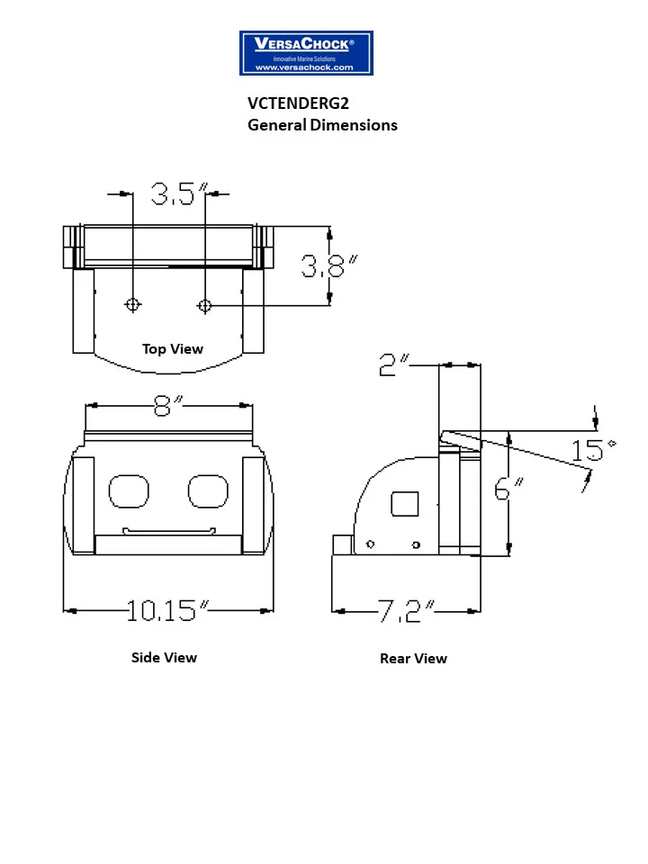 VersaChock generation 2 tender chocks are removable, super compact and universal. Perfect for securing rigid hull tenders, dinghies and jet skis on boat decks, swim platforms, and docks. Kits come with four permanently threaded deck plates, which are low profile and have smooth edges. Four removable, double wide HDPE bunks with hull cushioning strips remove quickly and store easily. Compatible with VersaChock’s exclusive blind fastener installation kits (VCBLINDWIDEDBL) for quick and easy installation. Remove chocks when not in use for a TRIP FREE deck! Dimensions (apx.) – 10″ L x 7″ W x 6″ T.