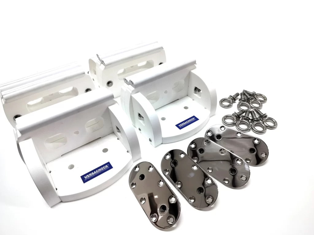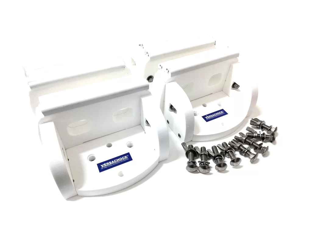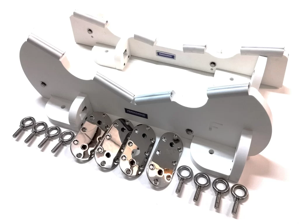 VersaChock generation 2 tender chocks are removable, super compact and universal. Perfect for securing rigid hull tenders, dinghies and jet skis on boat decks, swim platforms, and docks. Kits come with four permanently threaded deck plates, which are low profile and have smooth edges. Four removable, double wide HDPE bunks with hull cushioning strips remove quickly and store easily. Compatible with VersaChock’s exclusive blind fastener installation kits (VCBLINDWIDEDBL) for quick and easy installation. Remove chocks when not in use for a TRIP FREE deck! Dimensions (apx.) – 10″ L x 7″ W x 6″ T.