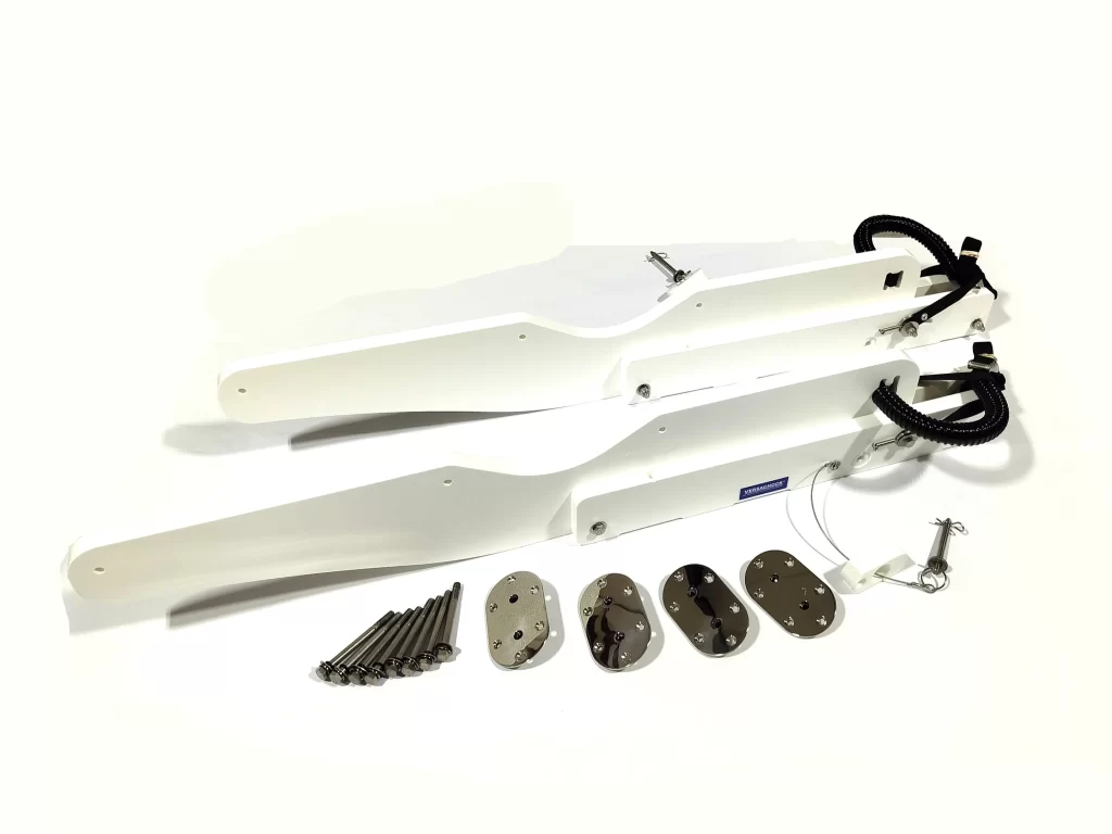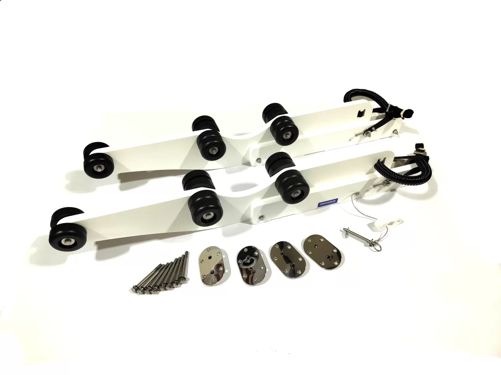 Tilting dinghy davits with wheels by VersaChock allow for easy loading of lighter weight dinghies onto swim platforms. Davits are removable by simply removing 4 bolts from our exclusive, super low-profile threaded deck plates (mini poly wrenches included, which are attached to hitch pin lanyards to prevent dropping them in the water!). Davit arms have an automatic self-latching feature, which locks the arms when rotated down (safety hitch pins must also be installed for securing arms). Limit straps are also included to limit the angle of the arms while loading. Includes 20 soft rubber wheels to help load watercraft and offers great support and cushioning for most hull shapes. Various winch options are offered separately. Also works great with VersaChock’s exclusive blind fastener system (VCBLINDWIDEDBL) when access to backside of mounting surface is not possible! Capacity: 350 lbs (standard platform mounting)/ 250 lbs (narrow platform mounting). Twenty four 1/4″ screws required for installation (not included). Dimensions (apx.) – 47″ L x 5″ W x 7″ T.